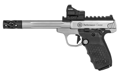 Smith & Wesson Performance Center Victory Target, Semi-Automatic, 22LR, 6″ Target Fluted Barrel with Muzzle Brake, Stainless Steel, Glass Bead Finish, Vortex Viper 6 MOA Red Dot Sight, Tandemkross “hiveGrips” with Target Thumbrest Grip, 10 Rounds, 2 Magazines, Thumb Safety 12079