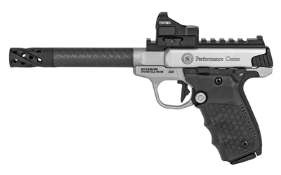 Smith & Wesson Performance Center Victory Target, Semi-Automatic,22LR, 6″ Target Carbon Fiber Barrel with Muzzle Brake, Stainless Steel, Glass Bead Finish, Vortex Viper 6 MOA Red Dot Sight, Tandemkross “hiveGrips” with Target Thumbrest Grip, 10 Rounds, 2 Magazines, Thumb Safety 12081