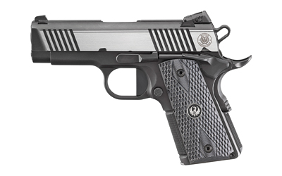 Ruger SR1911 Officer-Style, Semi-automatic, 45ACP, 3.6″ Barrel, Steel Frame, Two-Tone (Black Nitride/ Brushed Stainless) Finish, 7Rd, Ambidextrous Safety, Tritium Front Sight, Adjustable Rear Sight, 2 Magazines, Deluxe G10 Grips 6779
